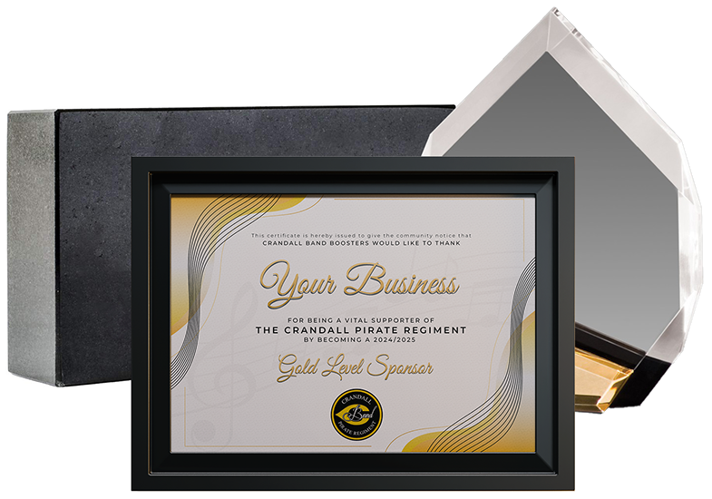 Crandall Band Boosters raises funds through a few channels. Money is raised through personal donations, selling of food at all home game concessions, selling parking passes and selling parking spaces at football games and so much more. Last year was our first with sponsors and we SOARED and were able to provide them so much more than years past! With your sponsorship this year, we will be able to provide the band with an amazing prop piece for the halftime show "StarCrossed" as well as software that will allow them to learn and practice on another level enhancing the learning and marching band experience. We are beyond excited for the year and hope that you will come along for the ride with us!
